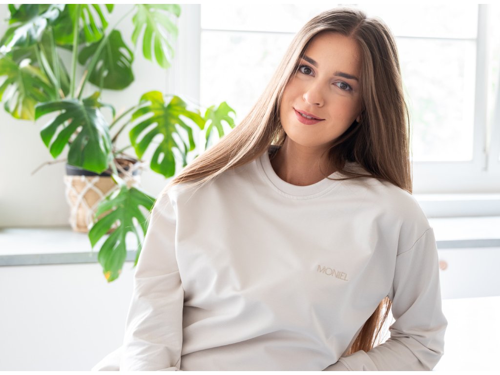 Je ušitá z velmi elastické látky, která je extrémně hebká a příjemná na dotek. Látku na Moniel mikinu jsme si nechali vyrobit na míru tak, aby byla heboučká, ale zároveň dlouho vydržela a netvořila žmolky. Vrchní vrstva látky je tkaná speciálním způsobem tak, aby vytvořila sametově jemný povrch, který je zároveň maximálně odolný. Můžete si tak být jistá, že i v případě častého praní zůstane mikina stále krásná. Tu hebkost ale musíte zažít, nelze ji popsat slovy.