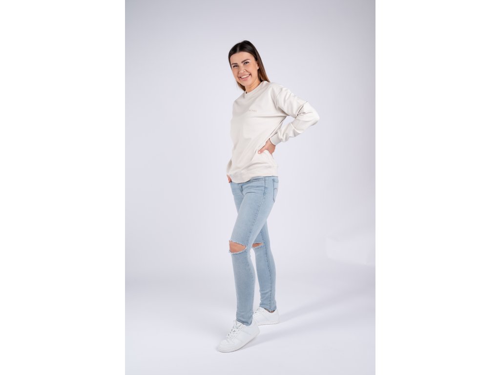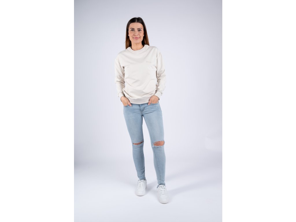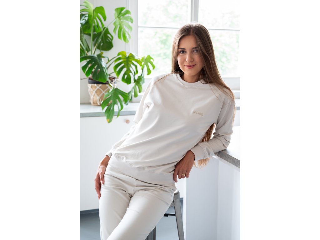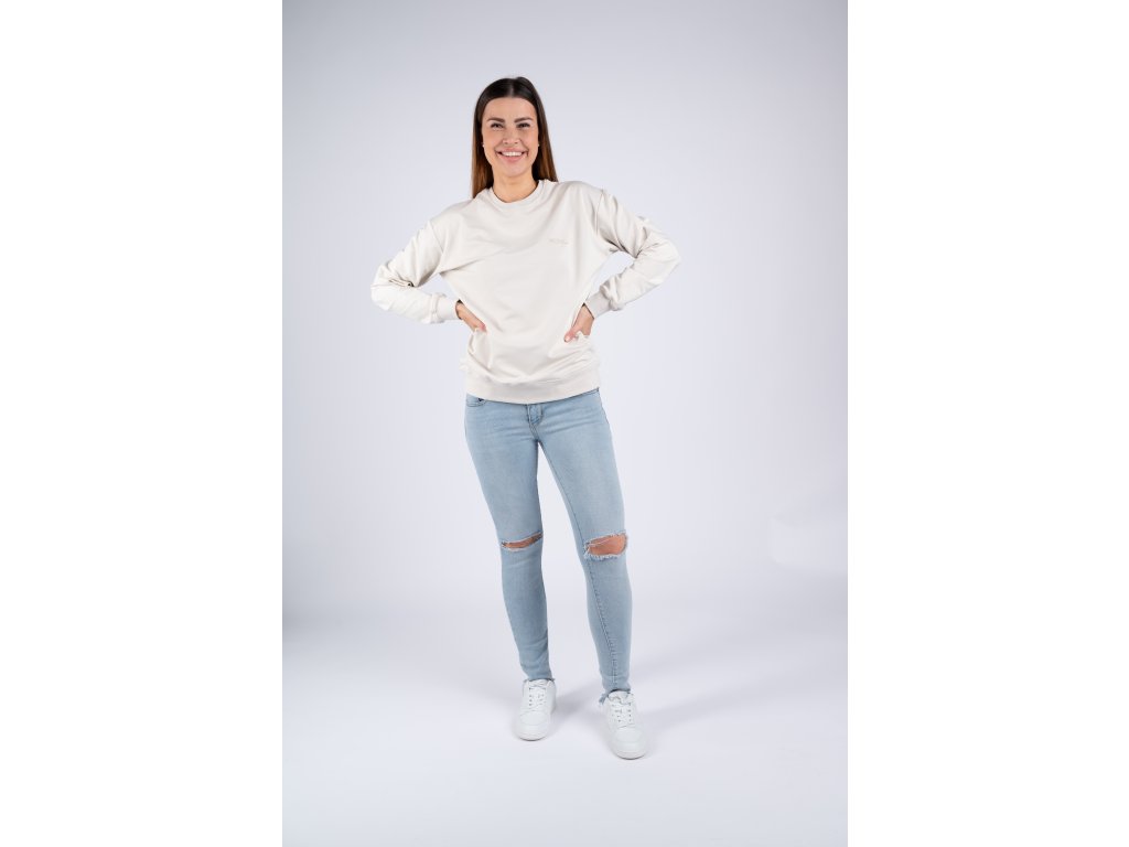 Světlá perlově béžová mikina je velmi elastická, takže se perfektně přizpůsobí vaší postavě a je tak pohodlná, že ji nebudete chtít už nikdy sundat.