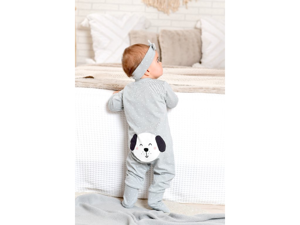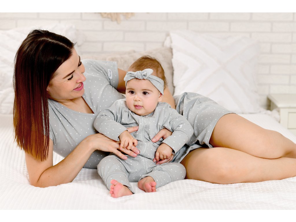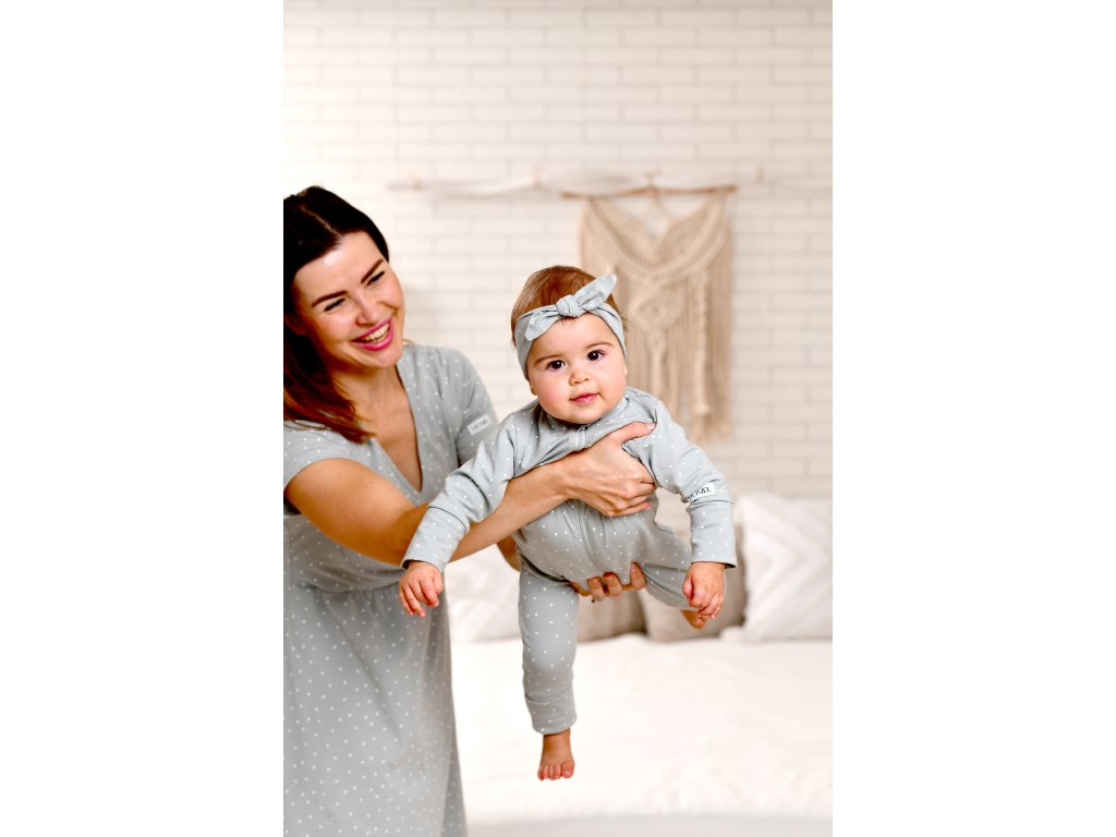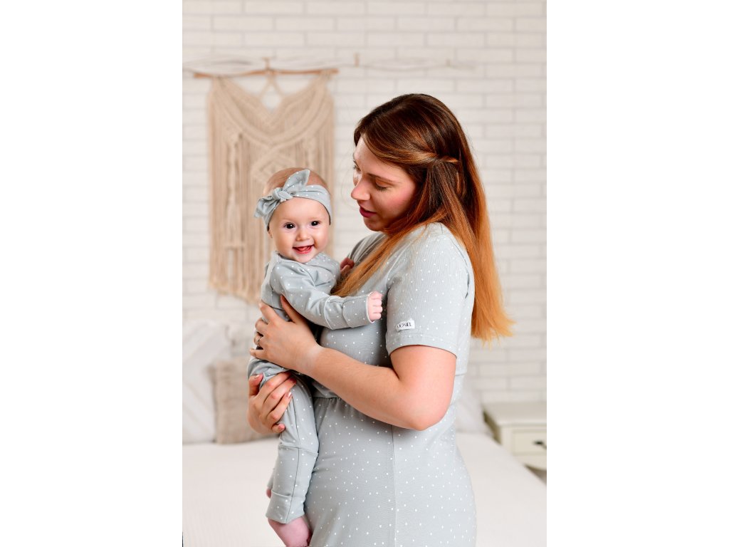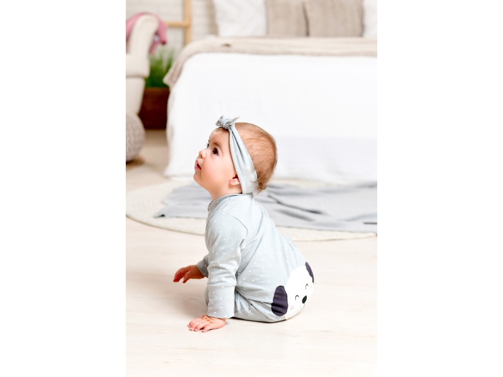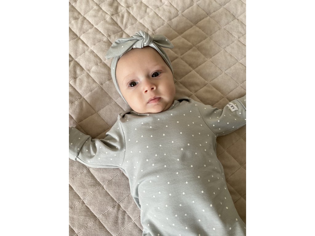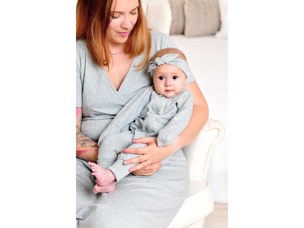 Dětská čelenka Dots šedá je stylovým a zároveň praktickým doplňkem pro miminka od prvních dnů života.