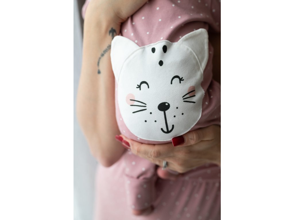 Je ručně ušitý v České Republice z přírodního materiálu příjemného na dotek. Materiál se nemačká, takže pokud nechcete, nemusíte jej žehlit. Autorský design overálku s tečkami doplňuje roztomilý obličej zvířátka na zadní straně overálku.