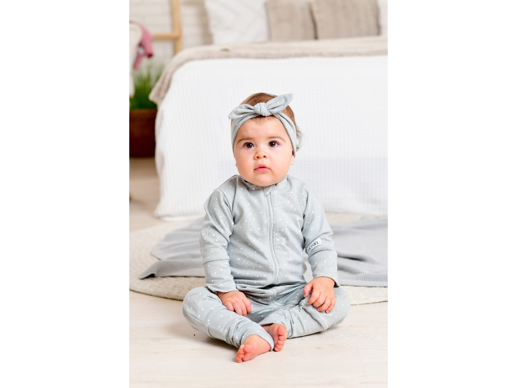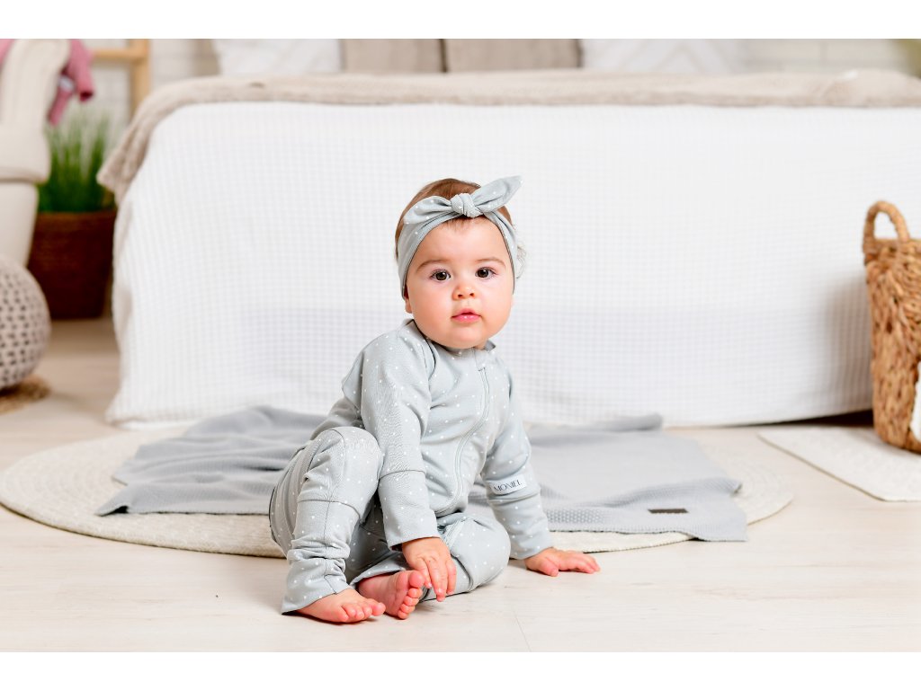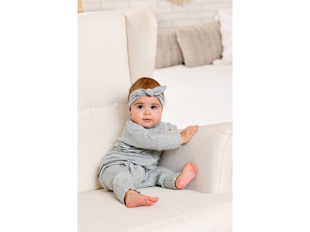 Rostoucí dětský overal na zip Moniel Overal pes Dots šedá je inovativní a jedinečný produkt svého druhu. Overal se dokonale přizpůsobí vašemu děťátku po celý rok.