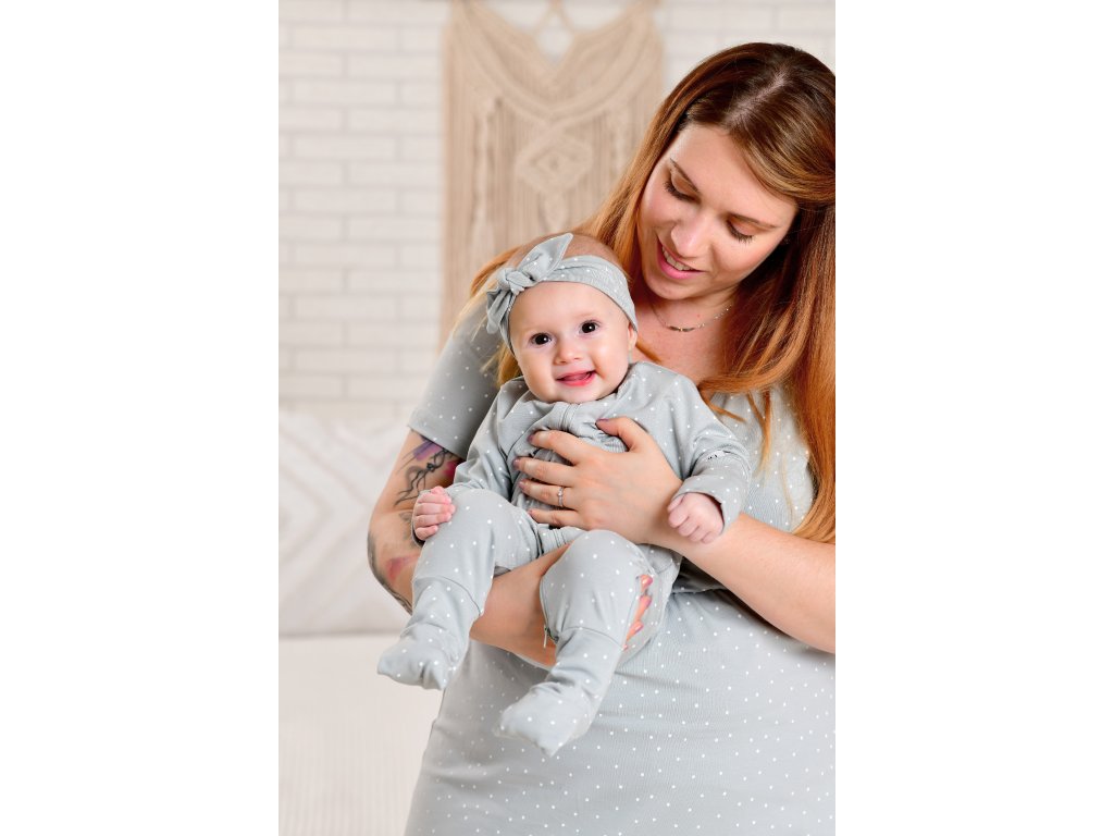 Je ručně ušitý v České Republice z přírodního materiálu příjemného na dotek. Materiál se nemačká, takže pokud nechcete, nemusíte jej žehlit. Autorský design overálku s tečkami doplňuje roztomilý obličej zvířátka na zadní straně overálku.
