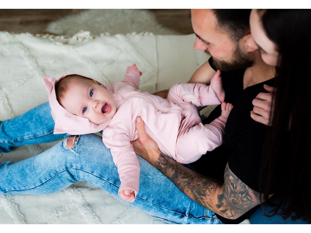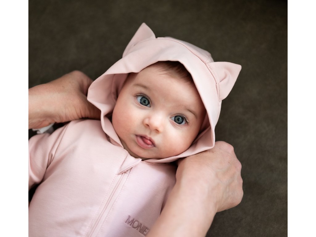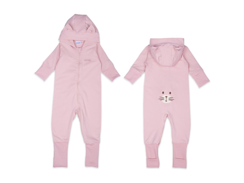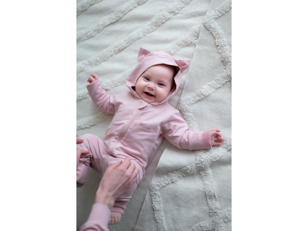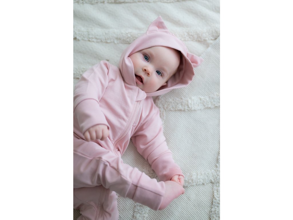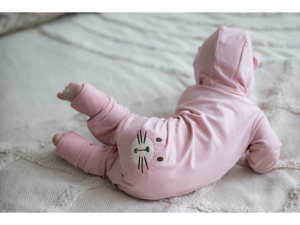 Pudrově růžový overal má kapuci s roztomilými kočičími oušky, která pomůže udržet hlavičku miminka v teple a zároveň doplňuje overálek o krásný designový prvek.