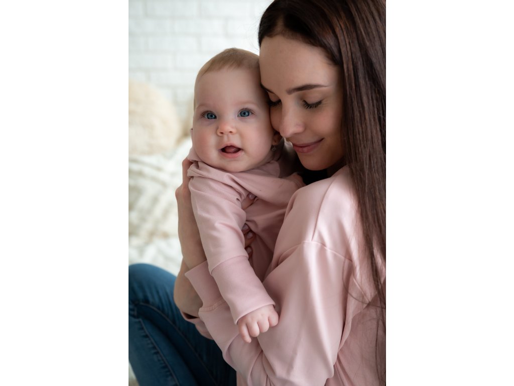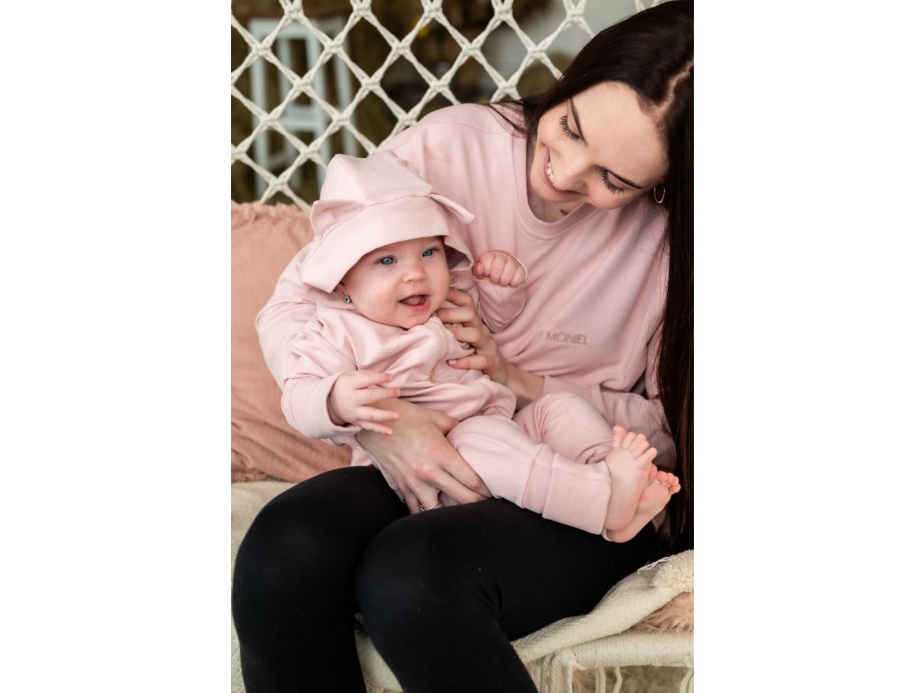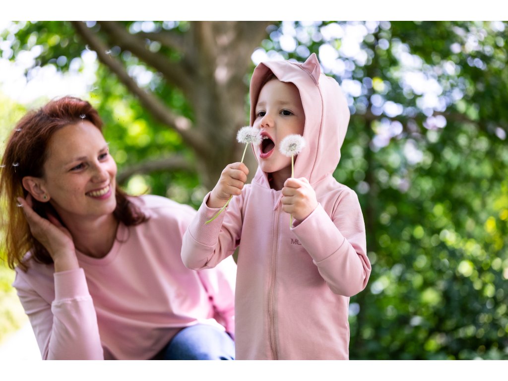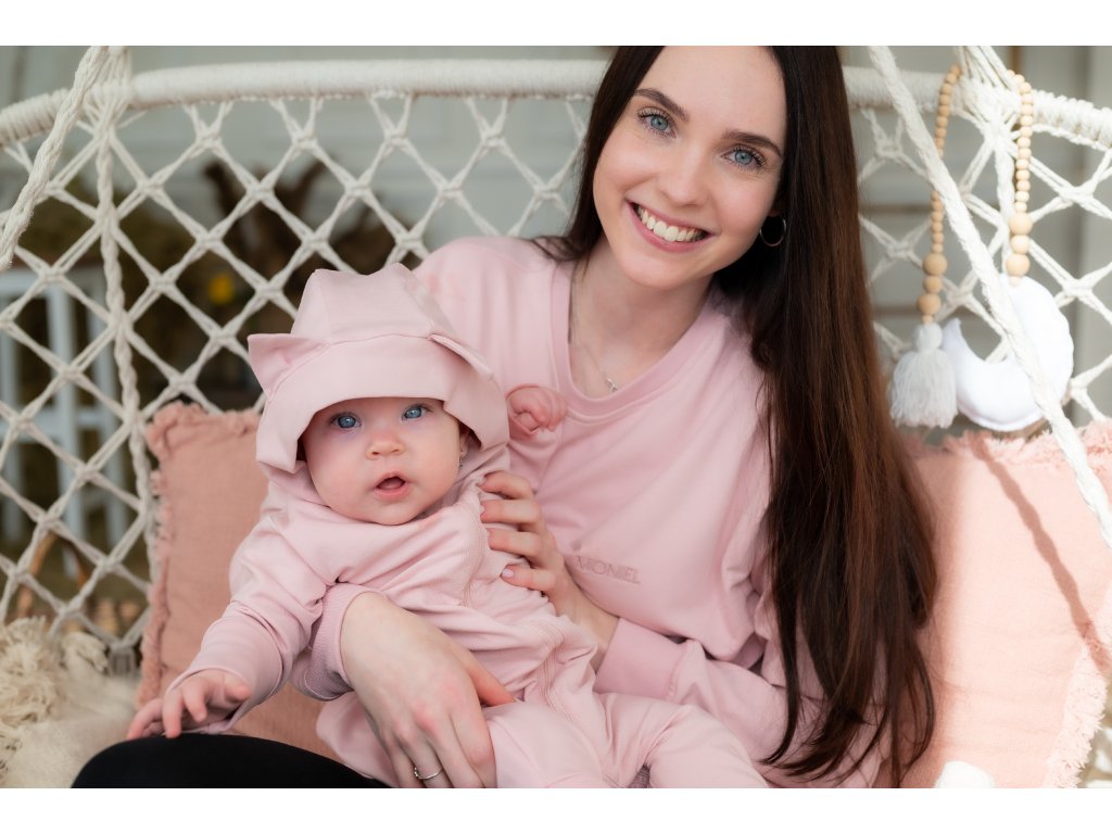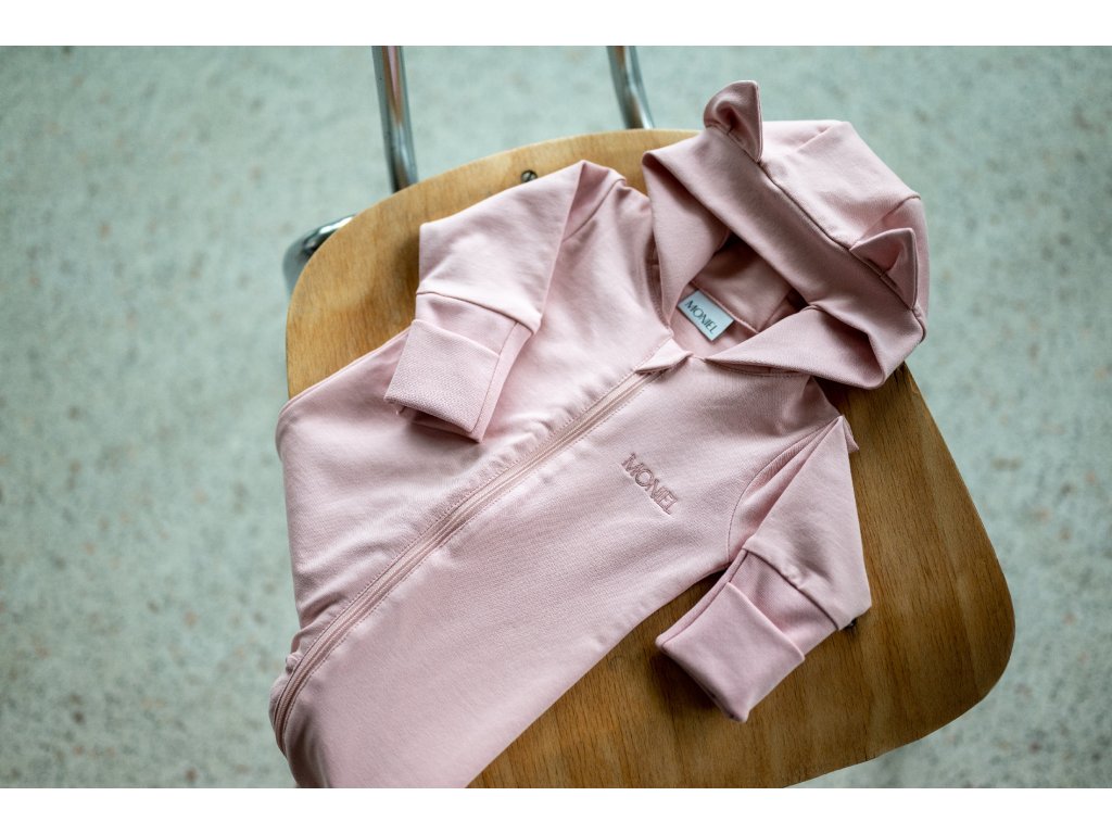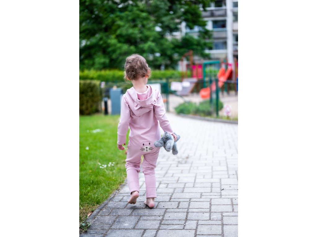 Pudrově růžový overal má kapuci s roztomilými kočičími oušky, která pomůže udržet hlavičku miminka v teple a zároveň doplňuje overálek o krásný designový prvek.