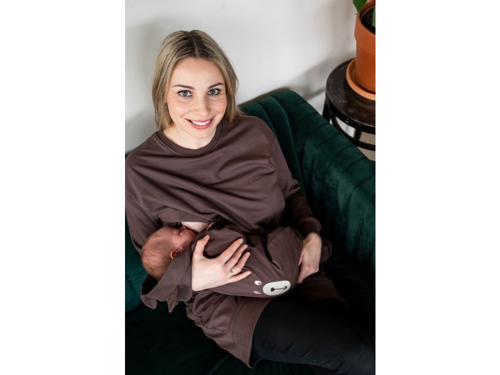 Tmavě hnědá mikina má dvě přední vrstvy látky. Díl umístěný blíže k vašemu tělu má uprostřed prostorný otvor, do kterého se lze velmi snadno dostat skrze speciální kapsy umístěné na díle předním. Tento jedinečný střih vám tak dovolí kojit kdykoli a kdekoli, aniž by bylo vidět více, než byste si sama přála.