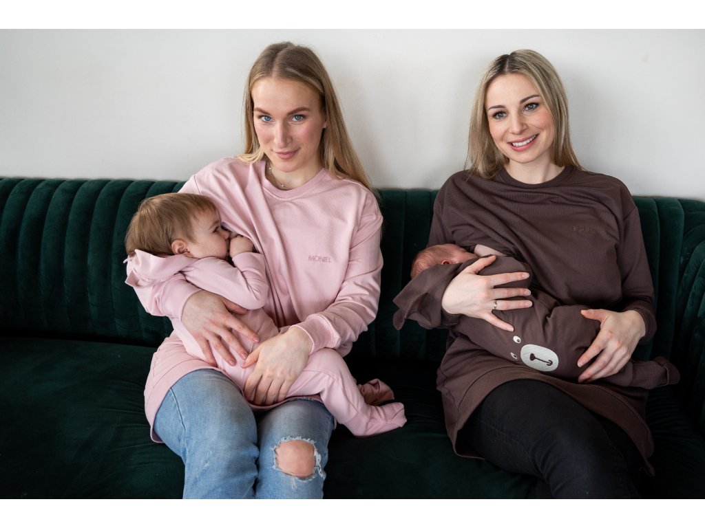 Kojící mikina Moniel Basic má dlouhý střih a končí v oblasti stehen či kolen, v závislosti na vaší výšce. Mikinu můžete nosit již během těhotenství, protože je dostatečně prostorná na zakrytí těhotenského bříška.
