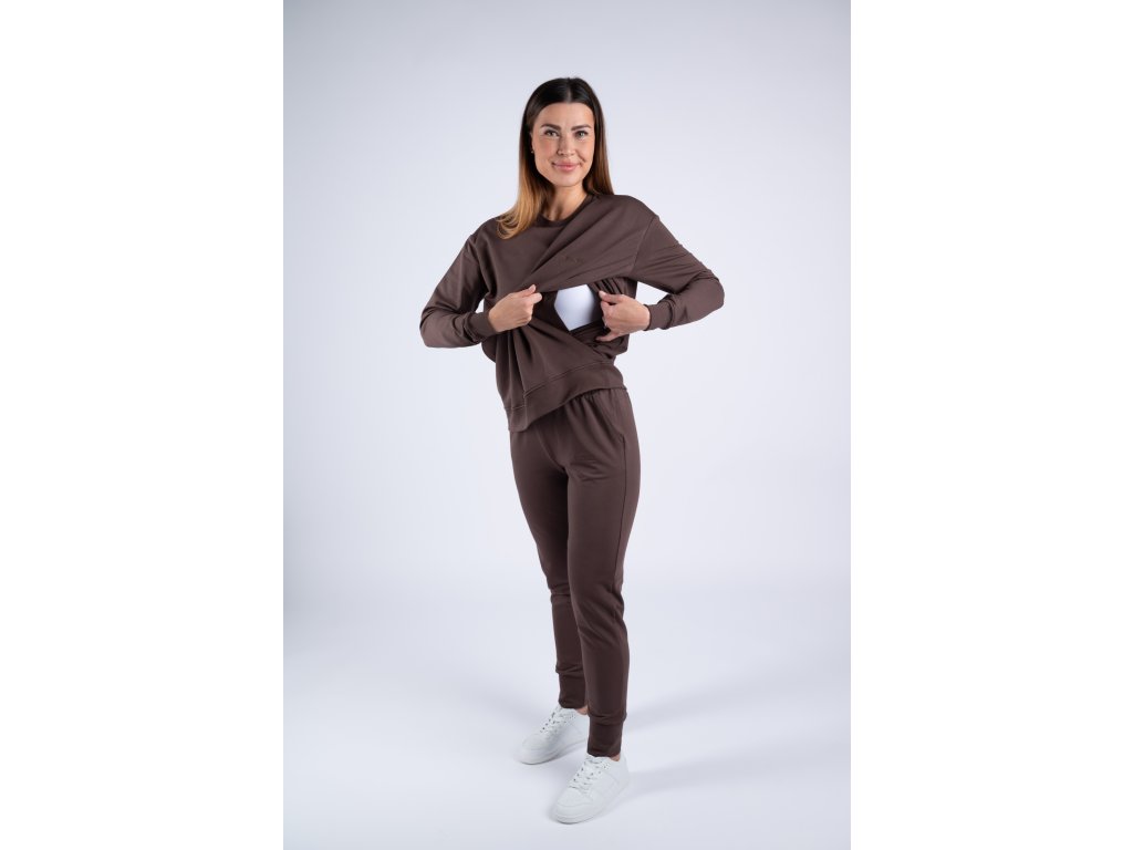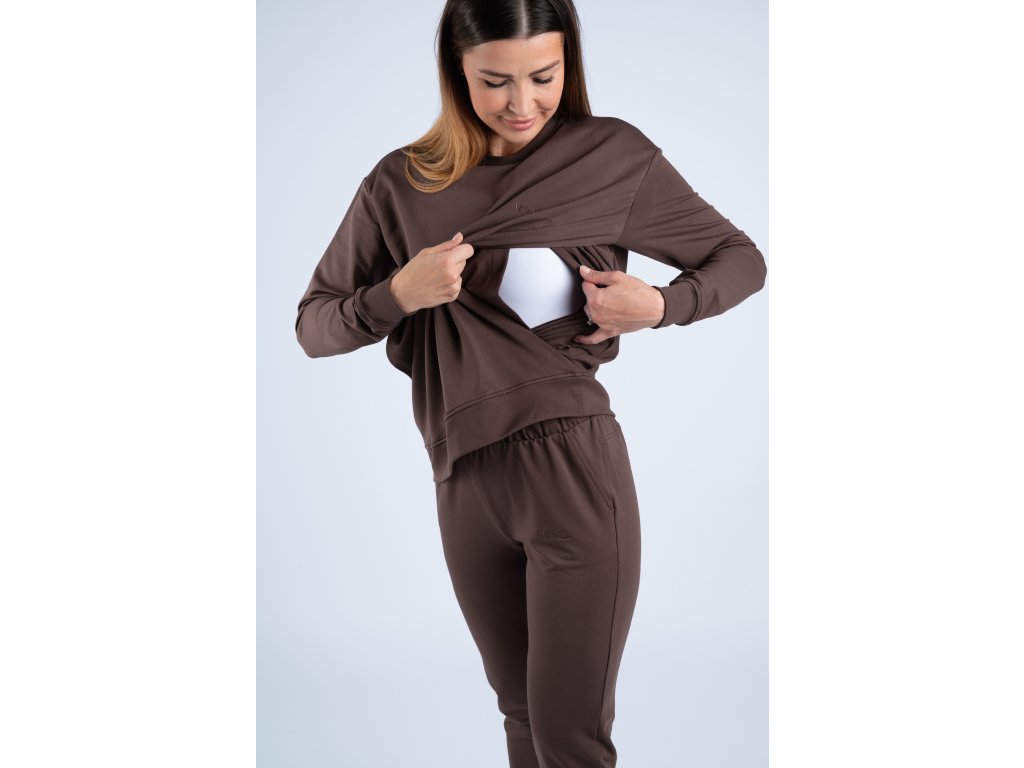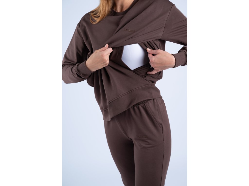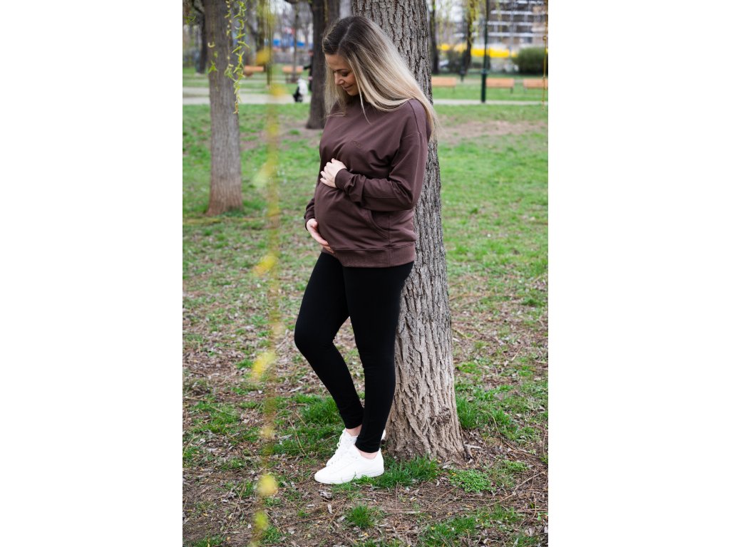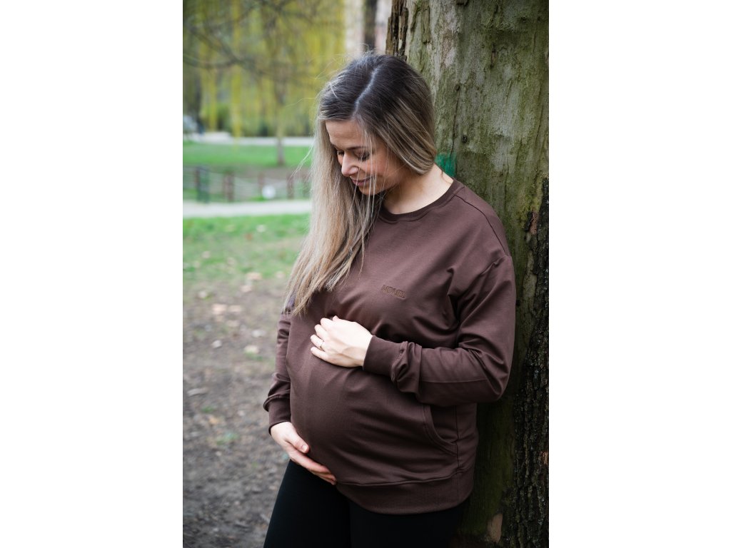 Tmavě hnědá mikina má dvě přední vrstvy látky. Díl umístěný blíže k vašemu tělu má uprostřed prostorný otvor, do kterého se lze velmi snadno dostat skrze speciální kapsy umístěné na díle předním. Tento jedinečný střih vám tak dovolí kojit kdykoli a kdekoli, aniž by bylo vidět více, než byste si sama přála.