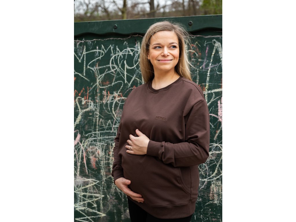 Kojící mikina Moniel Basic má krátký střih a končí přibližně v oblasti boků. Mikinu můžete nosit již během těhotenství, protože je dostatečně prostorná na zakrytí těhotenského bříška.