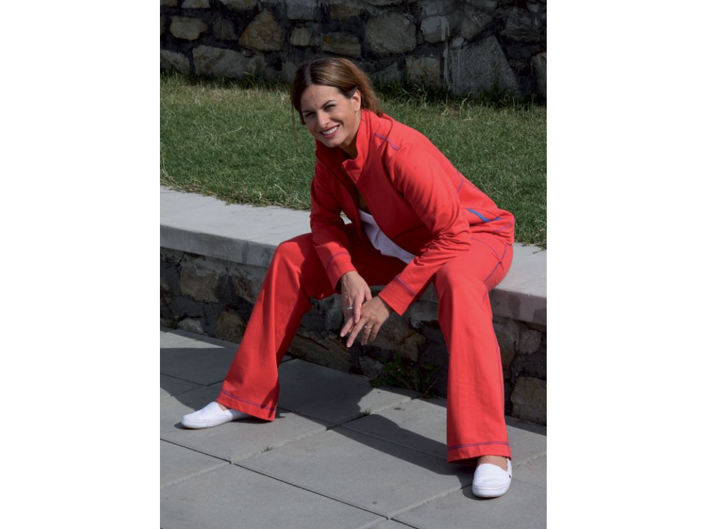 Pohodlná, nejen těhotenská bavlněná mikina cihlové barvy je áčkového střihu zapínaná na zip. Se stojáčkem, kontrastně lemovanými kapsami a ozdobným prošíváním.