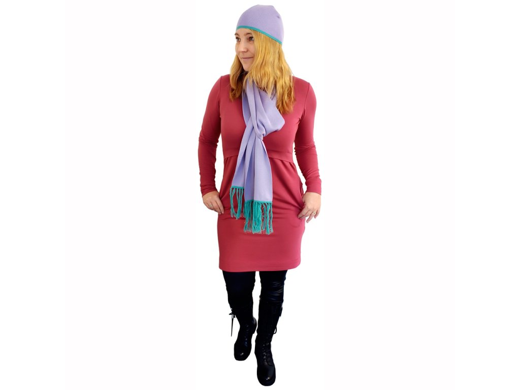 Kojící a těhotenské teplákové šaty z modalu s malým kulatým výstřihem a dlouhými rukávy. Přední díl je podstřižený pod prsy. Přes přeložené (překřížené) kojící vsadky je umístěný vrchní krycí díl, který poskytuje soukromí při kojení. Tento krycí díl je ukončen širším lemem, takže pěkně kopíruje postavu a neodstává. Výstřih a kojící vsadky jsou zapraveny lemovacími proužky. V bočních švech jsou umístěny kapsy. Vzhledem k použitému materiálu jsou šaty jemné a velmi příjemné při nošení.