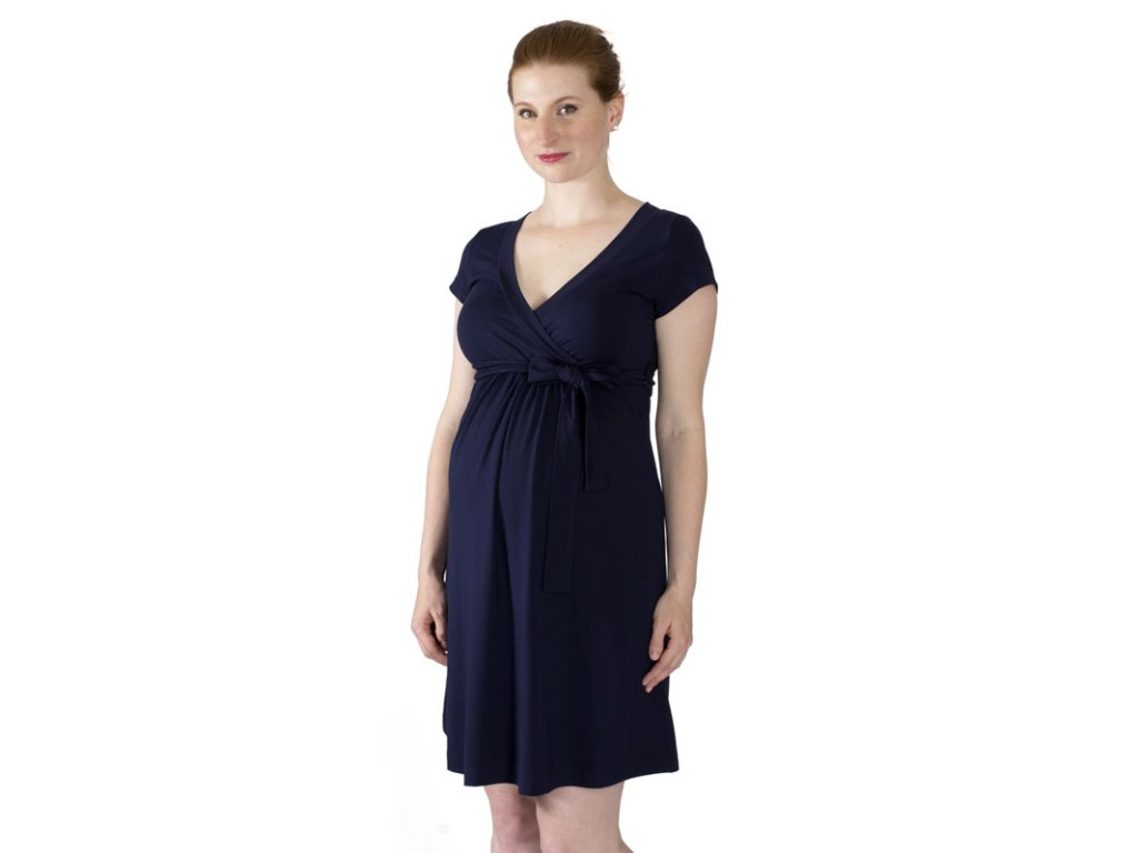 Elegantní tmavě modré letní těhotenské šaty z velmi příjemného elastického materiálu s výstřihem do V a vazačkou. Vhodné do práce, společnosti i volný čas.
