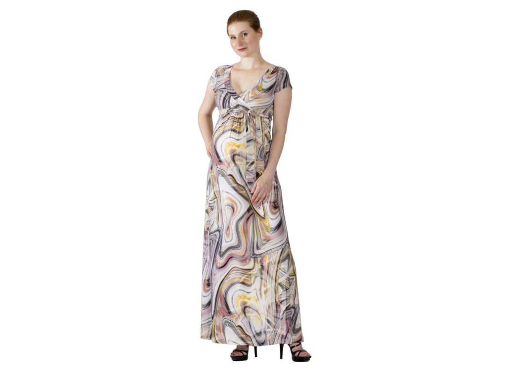 Elegantní letní těhotenské a kojicí šaty z velmi příjemného elastického materiálu a výstřihem do V. Pohodlné kojení je zajištěno díky přeloženým vrchním dílům. Mají krátký rukáv, přední díl je podstřižený pod prsy a sukňová část je nařasená, čímž vznikne volnost pro rostoucí bříško. Šaty jsou vhodné pro slavnostnější příležitost, ale využijete je i do práce a volný čas. Dají se nosit nejen v období těhotenství, ale také po porodu, kdy se vám bude postava postupně vracet do původních proporcí.