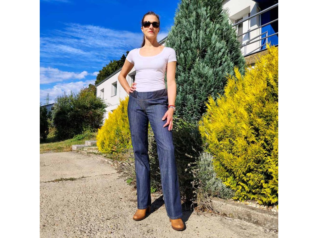 Těhotenské bavlněné džíny středně modré barvy. Přední díl s falešným zapínáním. Zadní díl s páskem s poutky, sedlem a nakládanými kapsami s nýtky a kontrastním prošíváním. Boční šev kalhot je rovněž prošitý. Pas je ukončený pohodlným úpletovým dílem s nastavitelným obvodem pomocí dírkové gumy. Kalhoty tak můžete nosit i bez bříška.