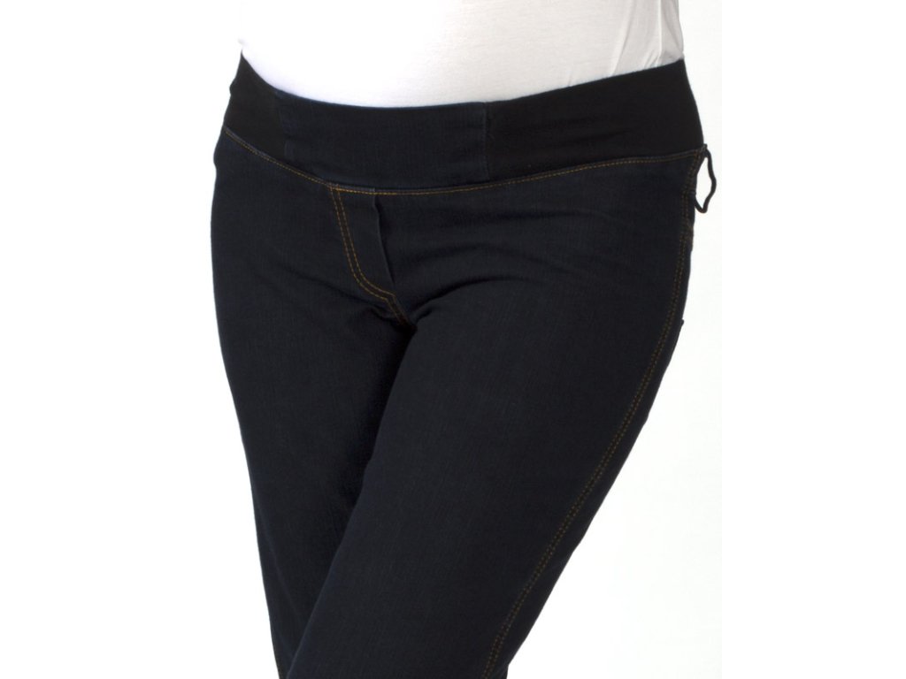 Nadčasové tmavě modré bavlněné těhotenské džíny s bohatým prošíváním a nakládanými kapsami a sedlem na zadním dílu. Pasují k většině kousků ve Vašem šatníku.