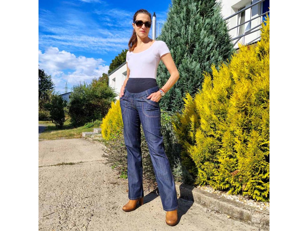 Těhotenské bavlněné džíny středně modré barvy. Přední díl s nakládanými kapsami s nýtky a kontrastním prošíváním a falešným zapínáním. Zadní díl se sedlem a nakládanými kapsami s nýtky a kontrastním prošíváním. Boční šev kalhot je rovněž prošitý. Pas je ukončený pružným páskem s poutky a vysokým pohodlným úpletovým dílem s nastavitelným obvodem pomocí dírkové gumy.