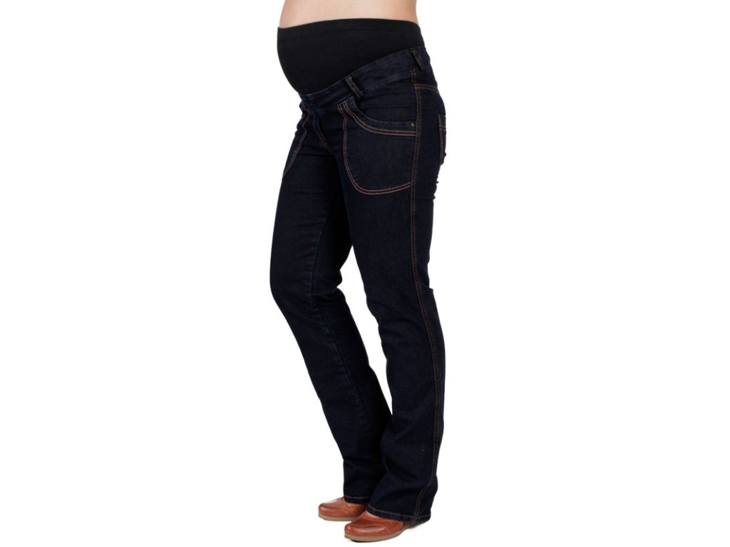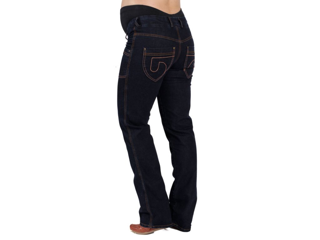 Vypracované těhotenské jeansy s bohatým štepováním a nakládanými kapsami vpředu i vzadu.