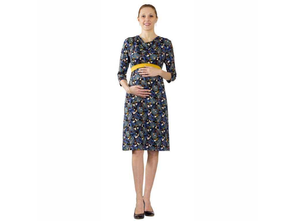 Elegantní nejen těhotenské šaty s 3/4 rukávy a výstřihem typu voda. Z viskózového úpletu s drobnými kvítky a listy monstery. Vhodné do zaměstnání i volný čas.