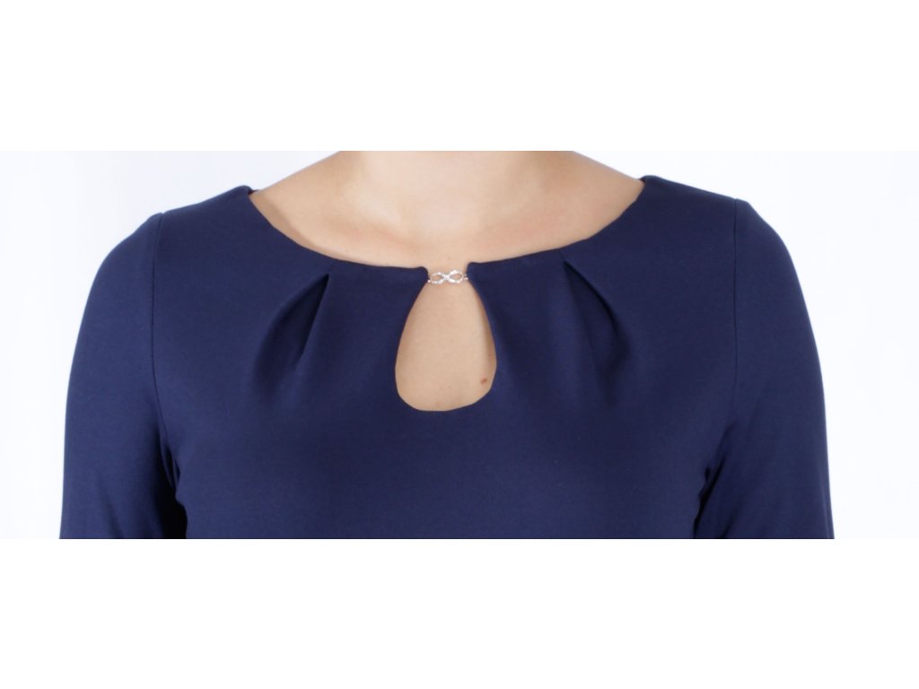 Exkluzivní těhotenské nejen společenské šaty úzké siluety s nápaditě řešeným výstřihem.V nestárnoucí a elegantní tmavě modré barvě zazáříte v každé společnosti.