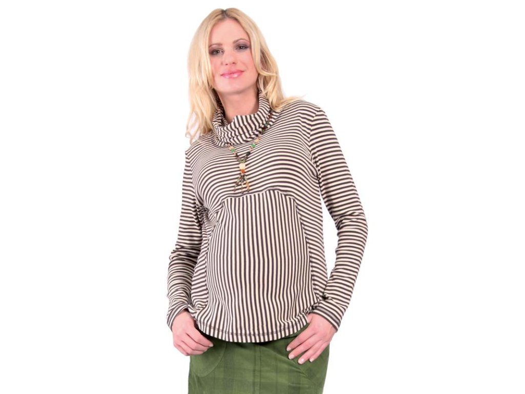 Těhotenský rolák z velmi příjemného bavlněného materiálu. Má vysoký volnější rolák, který je možné různě upravovat. Další zajímavou částí je opačně vsazené proužkované bříško.