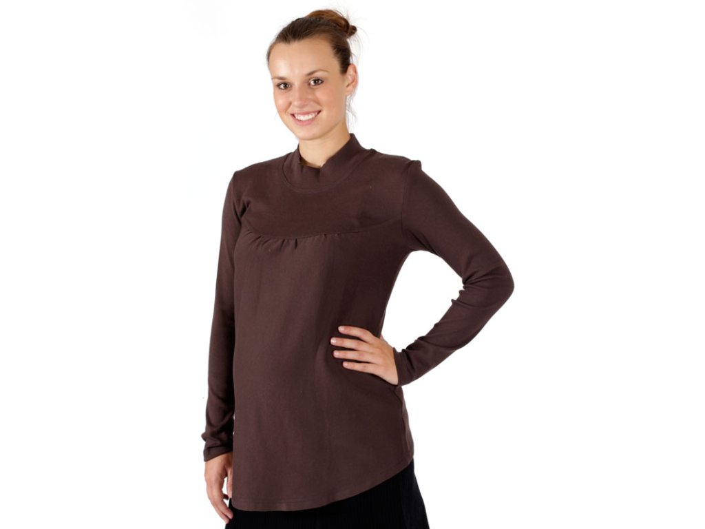 Velmi příjemné nejen těhotenské hřejivé bavlněné tričko v hnědé barvě s nízkým stojáčkem a dlouhými rukávy. Přední díl je členěný sedlem a mírně nařasený.
