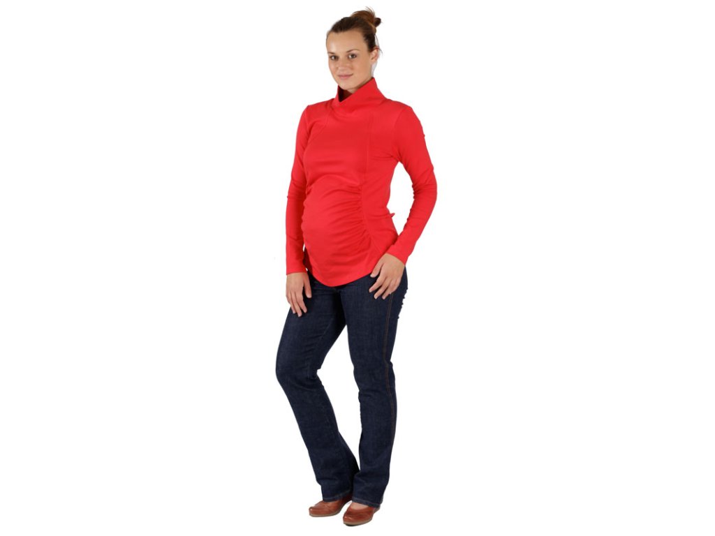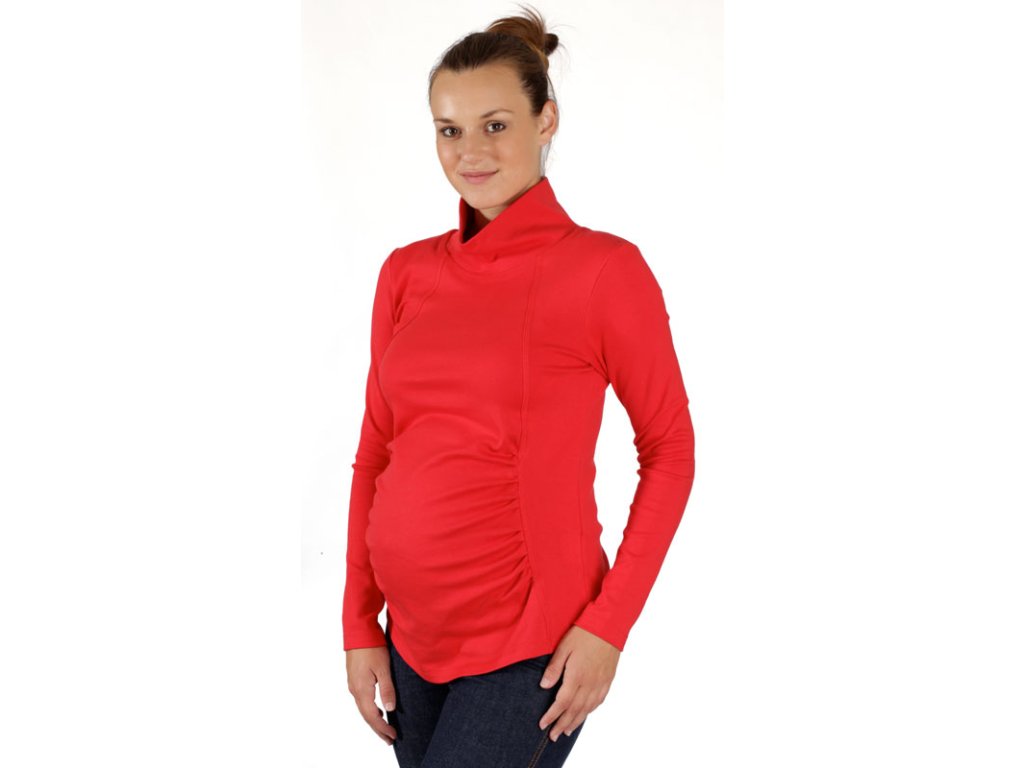 Pohodlné bavlněné těhotenské triko v jasně červené barvě. S dlouhým rukávem a stojákem. Přední díl je členěný a řasený pro volnost bříška. Pěkně vás zahřeje.