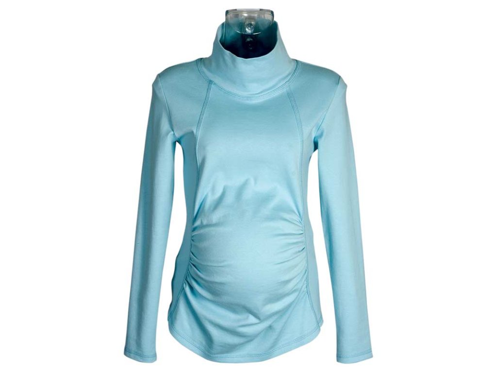 Pohodlné bavlněné těhotenské triko v bledě modré barvě. S dlouhým rukávem a stojákem. Přední díl je členěný a řasený pro volnost bříška. Pěkně vás zahřeje.