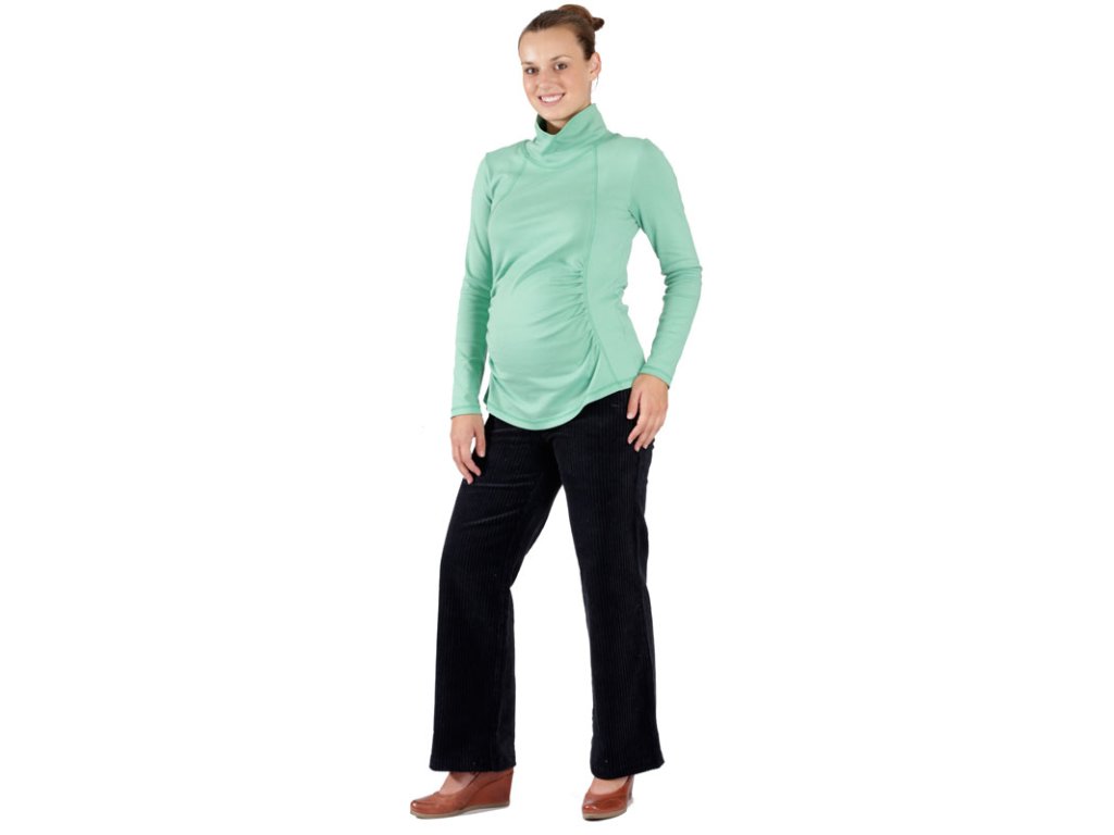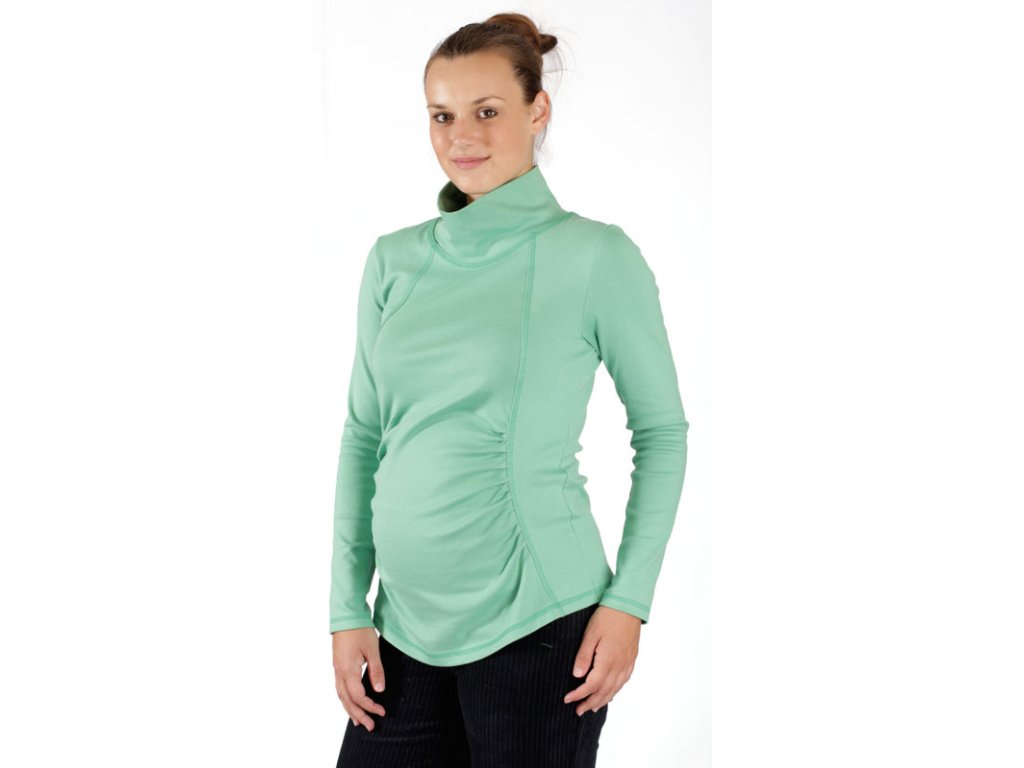 Pohodlné bavlněné těhotenské triko v zelené barvě. S dlouhým rukávem a stojákem. Přední díl je členěný a řasený pro volnost bříška. Pěkně vás zahřeje.