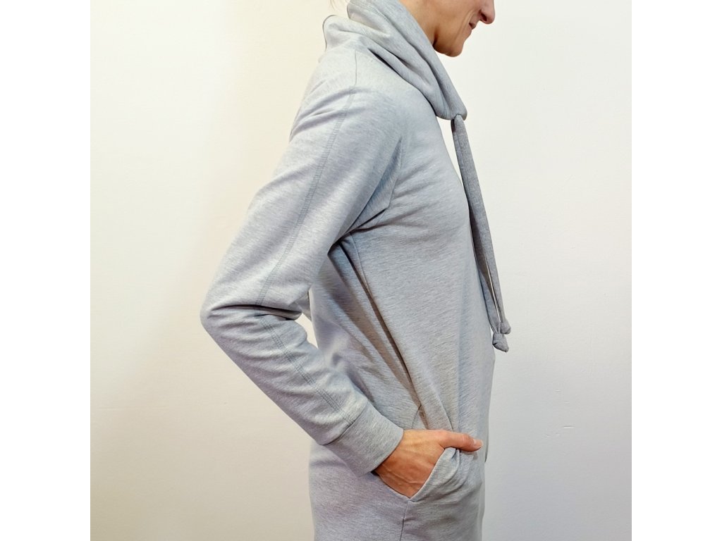 Pohodlné, nejen těhotenské mikinošaty sportovně elegantního stylu s vysokým stojáčkem a prostornými kapsami v bočních švech. Na rukávech je středem ozdobné prošití a jsou ukončené manžetou. Ve spodní části bočních švů jsou rozparky pro větší volnost pohybu. Mikinošaty jsou vyrobeny z oblíbené měkké bavlněné teplákoviny světle šedé barvy.